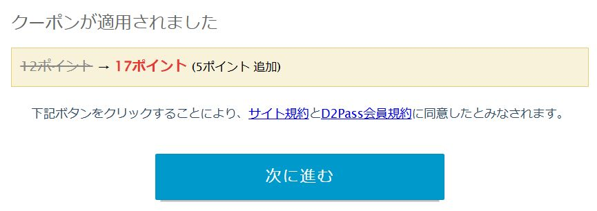 10ドルクーポンが正常に適用されると、お試しポイントが合計で17ポイントになります。クーポン無しだとお試しポイントは12PTで、10ドルクーポンで5PTプラスされます。