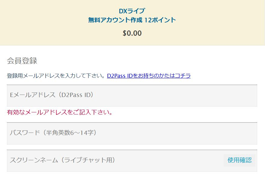 DXLIVEの登録情報を入力するページに移動するため、必要事項を入力します。